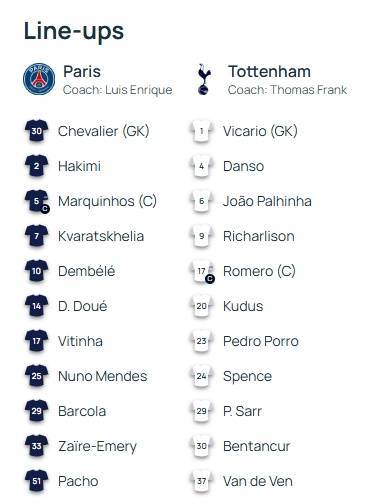 直播吧8月14日讯 北京时间03:00,欧洲超级杯决赛,巴黎圣日耳曼对阵热刺,赛前双方首发阵容出炉!文字版首发更新中......欧洲超级杯是由欧足联主办的年度足球赛事,每年在欧冠冠军与欧联杯冠军之间进行一场对决。巴黎上赛季法甲26胜6平2负积84分稳坐联赛第1,夺得当季欧冠冠军;热刺上赛季英超11胜5平22负积38分位居联赛第17,最终夺得欧联杯冠军。